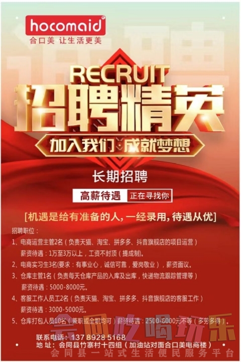 面向会同各乡镇招聘电商合伙人,最好是夫妻搭档,一个从事营业员,一个从事...