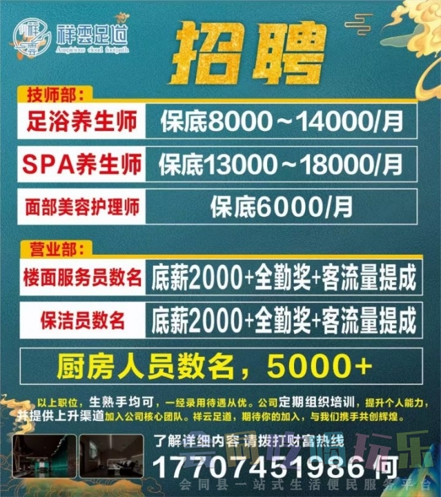 会同祥云足道招聘厨房打杂,小厨,服务员,技师等,一经录用,待遇从优。...