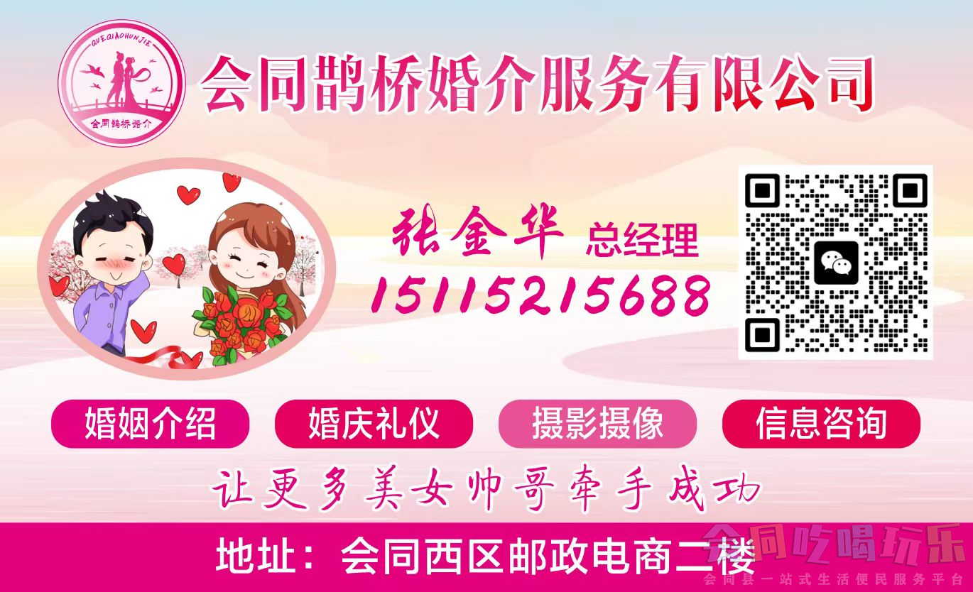 会同鹊桥婚恋是一家正规、高端、靠谱、真实、口碑好、没有托的本地婚恋平台、婚恋交友平台、靠谱相亲平台、靠谱征婚平台、单身速配平台、大龄单身相亲平台、线下相亲活动、相亲交友网站、婚介公司、婚姻介绍所及闪婚服务,服务于会同等地客户。